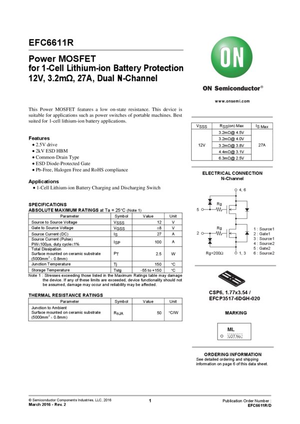 EFC6611R Power MOSFET for 1-Cell Lithium-ion Battery Protection, 12V, 3.2mΩ, 27A, Du...