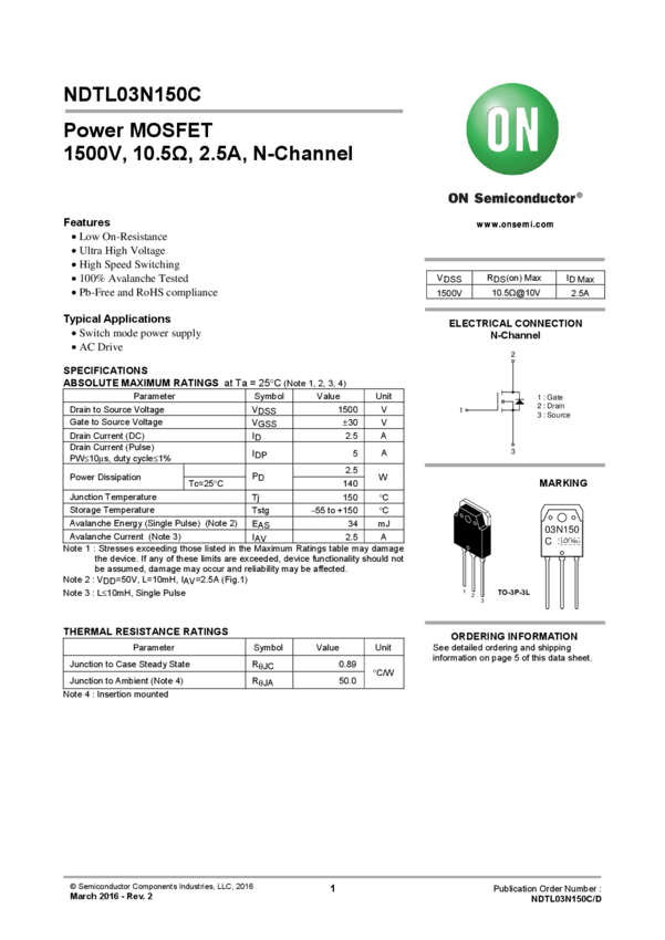 NDTL03N150C Power MOSFET, 1500V, 10.5Ω, 2.5A, N-Channel