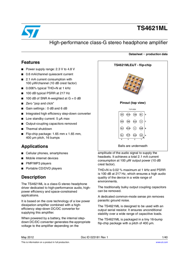 TS4621ML High-performance class-G stereo headphone amplifier