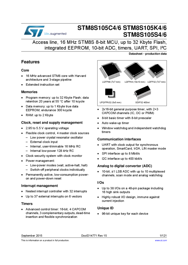 STM8S105K6 Mainstream Access line 8-bit MCU with 32 Kbytes Flash, 16 MHz CPU, integrat...