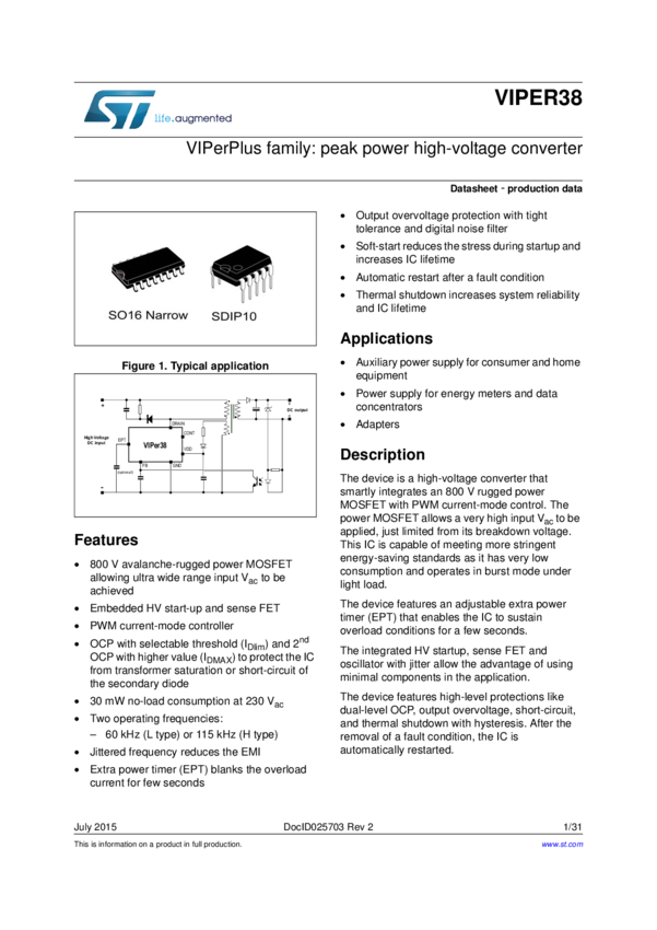 VIPER38 VIPerPlus family: Peak power fixed frequency high voltage converter