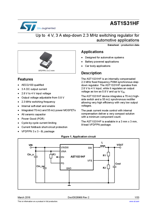 AST1S31HF Up to 4 V, 3 A step-down 2.3 MHz switching regulator for automotive applic...