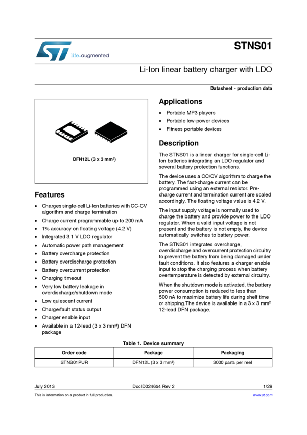 STNS01 Li-Ion Linear Battery Charger with LDO