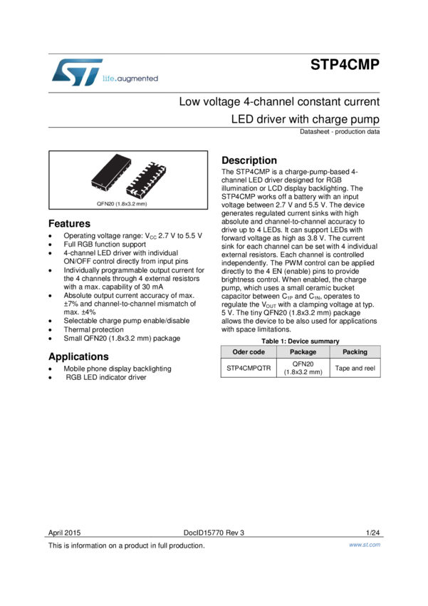STP4CMP Low voltage 4-channel constant current LED driver with charge pump