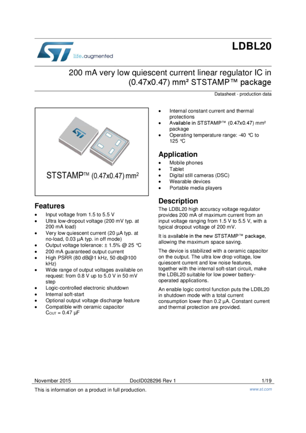 LDBL20 200 mA very low quiescent current linear regulator IC in (0.47x0.47) mA STS...