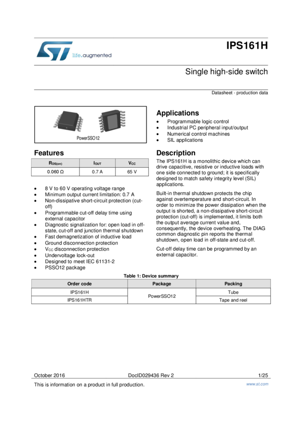 IPS161H Single high-side switch for safety integrity level (SIL2 and SIL3) complian...