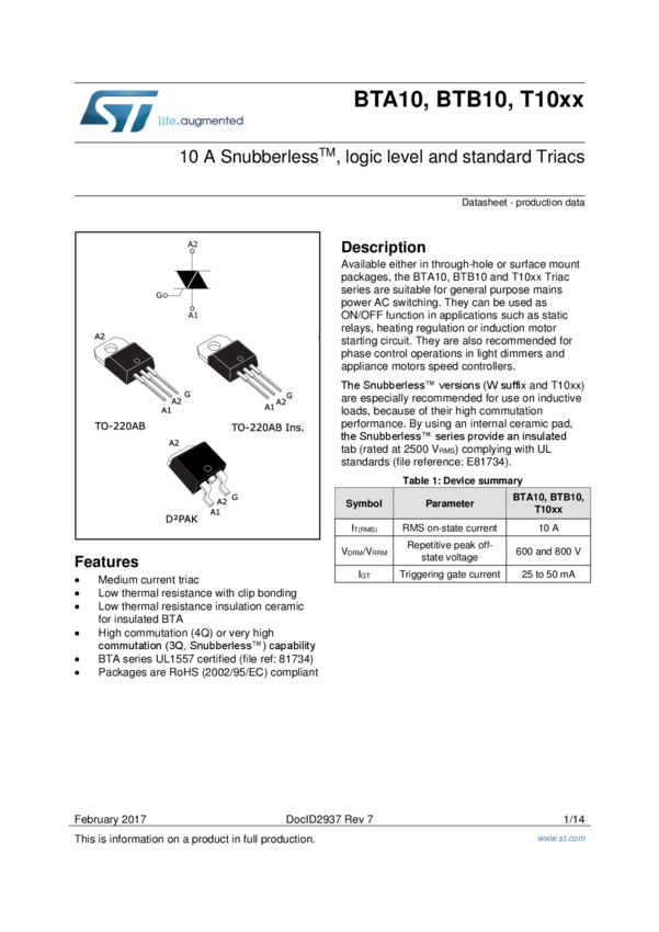 BTA10 10A standard and Snubberless™ Triacs