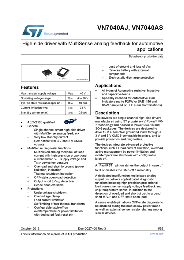 VN7040AJ High-side driver with MultiSense analog feedback for automotive application...