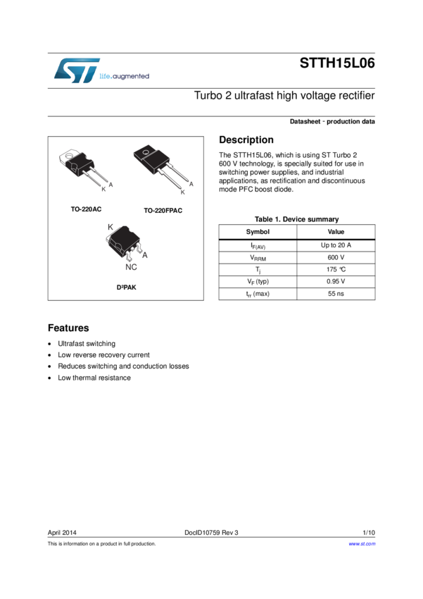 STTH15L06 TURBO 2 Ultrafast High Voltage Rectifier