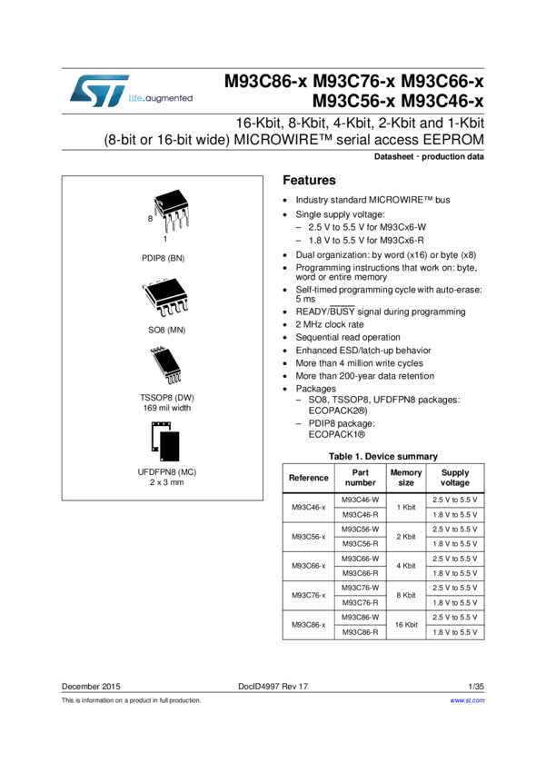 M93C46-W 1 Kbit (8-bit or 16-bit wide) MICROWIRE serial access EEPROM