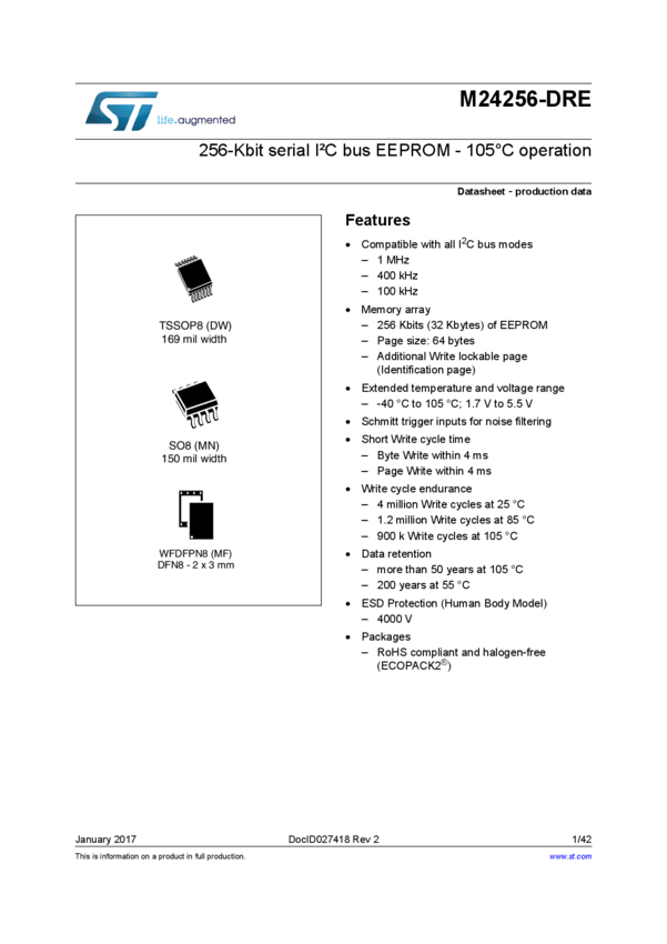 M24256-DRE 256-Kbit serial I2C bus EEPROM 105°C operation