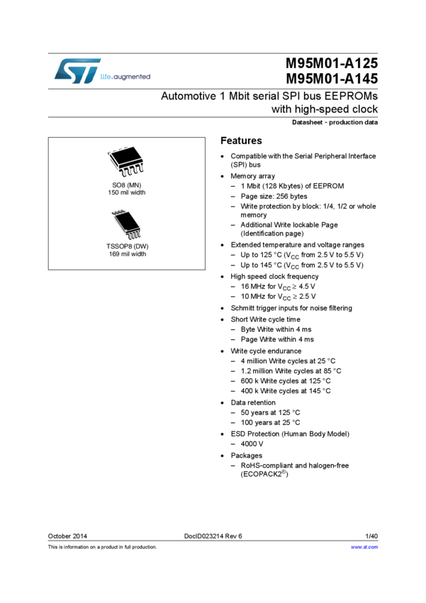 M95M01-A125 Automotive 1024 Kbit SPI bus EEPROM with high speed clock