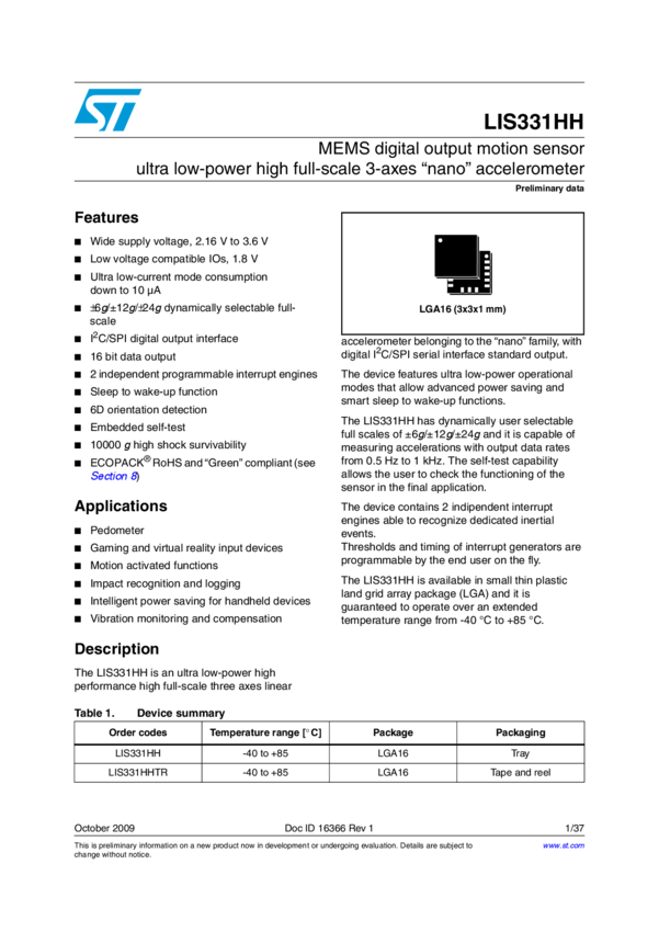 LIS331HH MEMS digital output motion sensor:ultra low-power high full-scale 3-axes na...