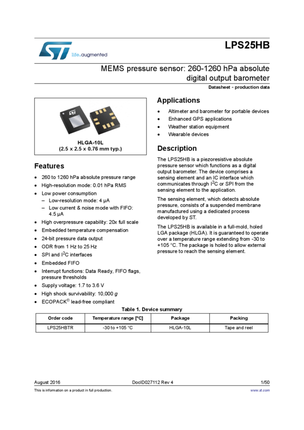 LPS25HB MEMS pressure sensor: 260-1260 hPa absolute digital output barometer