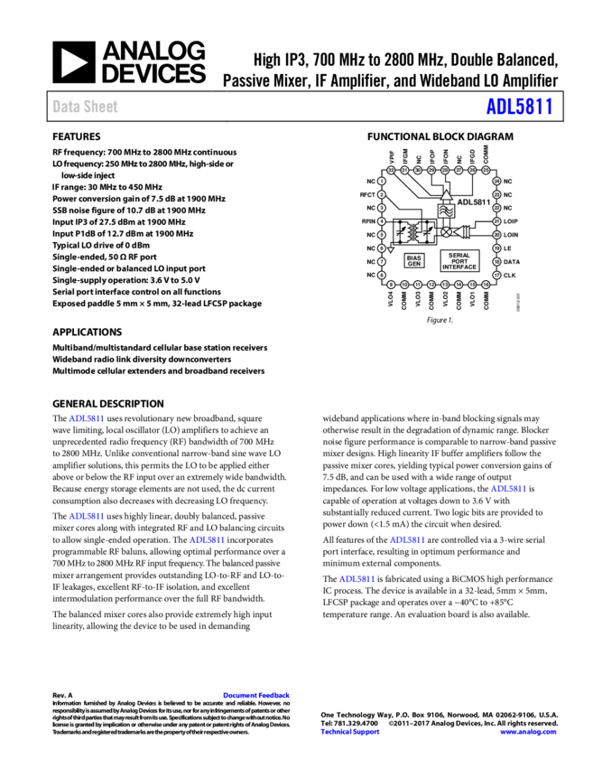 ADL5811 High IP3, 700 MH TO 2800 MH, Double Balanced, Passive Mixer, IF Amp, and Wi...