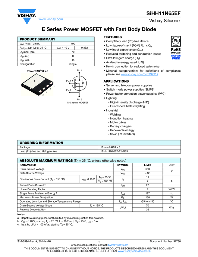 SiHH11N65EF E Series Power MOSFET with Fast Body Diode