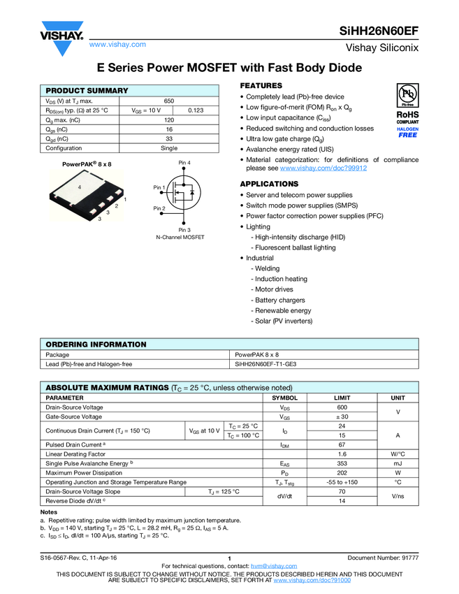 SiHH26N60EF E Series Power MOSFET with Fast Body Diode