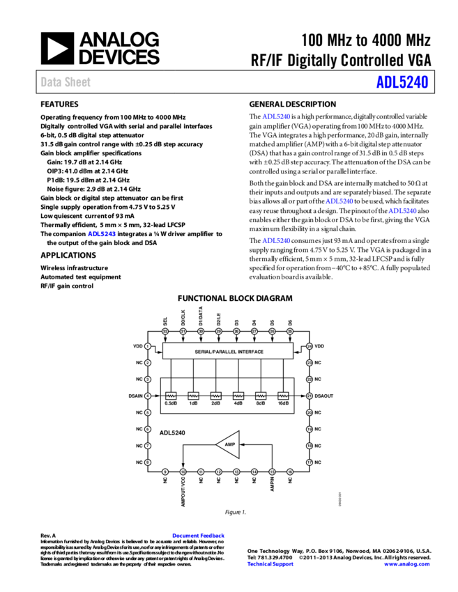 ADL5240 100 MH TO 4000 MH RF/IF Digitally Controlled VGA