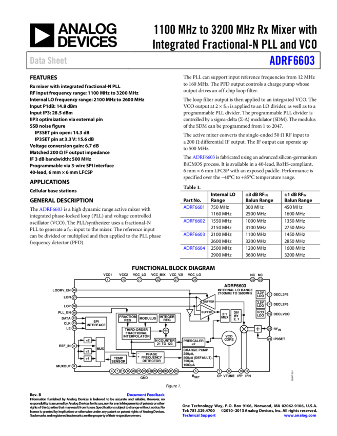 ADRF6603 1100 MH to 3200 MH R Mixer with Integrated Fractional-N PLL and VCO