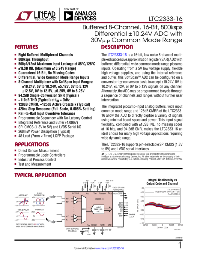 LTC2333-16 Buffered 8-Channel, 16-Bit, 800ksps Differential ±10.24V ADC with 30VP-P Co...