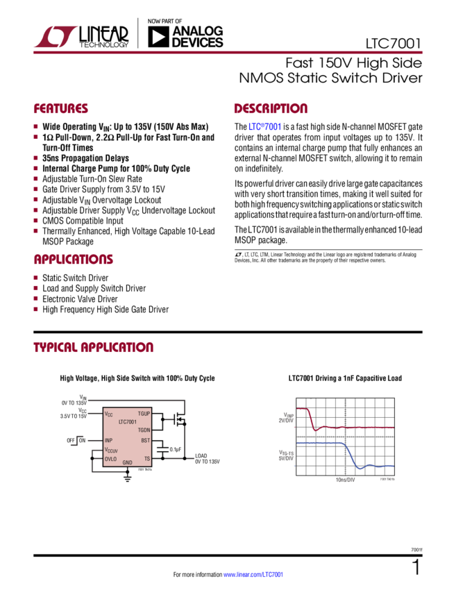 LTC7001 Fast 150V High Side NMOS Static Switch Driver