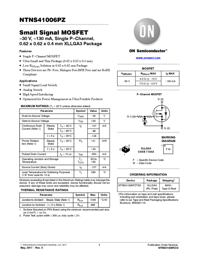 NTNS41006PZ Small Signal MOSFET, -30V P-Channel XLLGA3 Package