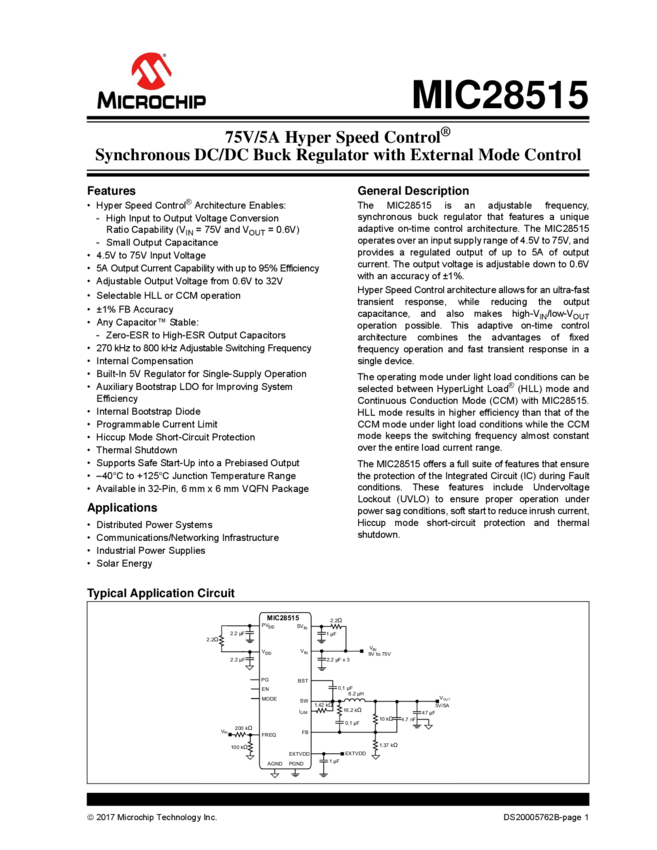 MIC28515 75V/5A Hyper Speed Control® Synchronous DC/DC Buck Regulator with Exter