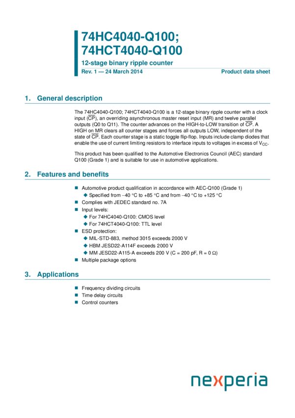 74HCT4040DB-Q100, 74HC4040DB-Q100, 74HCT4040BQ-Q100, 74HC4040BQ-Q100, 74HC4040PW-Q100, 74HCT4040D-Q100, 74HCT4040PW-Q100
