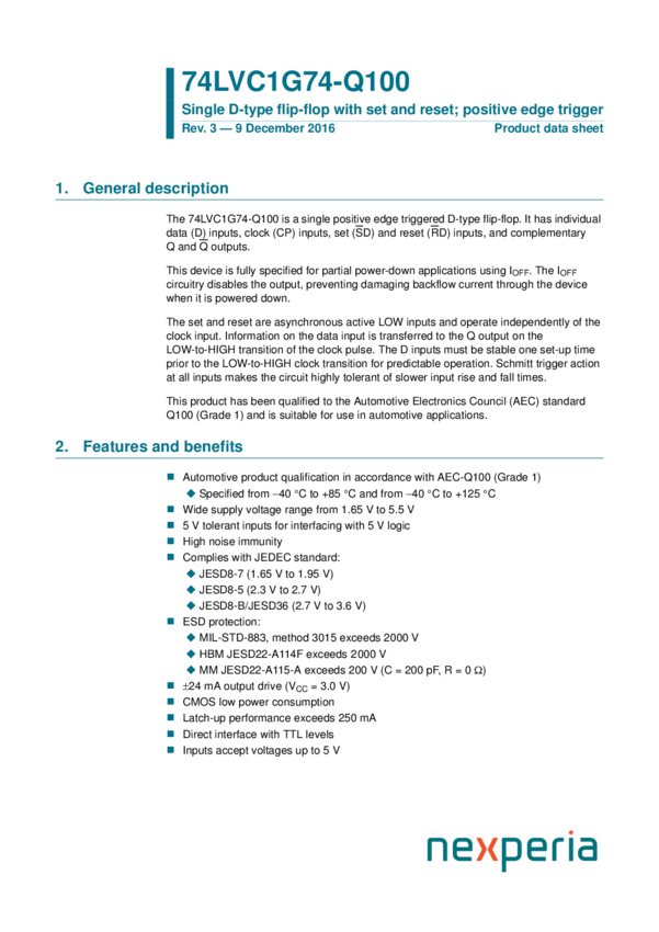 74LVC1G74DC-Q100 Single D-type flip-flop with set and reset; positive edge trigger