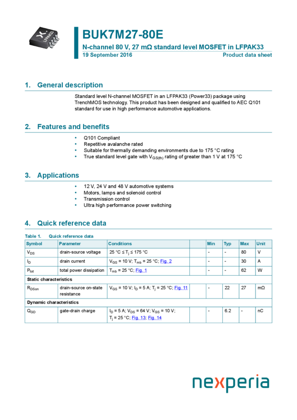 BUK7M27-80E N-channel 80 V, 27 mΩ standard level MOSFET in LFPAK33