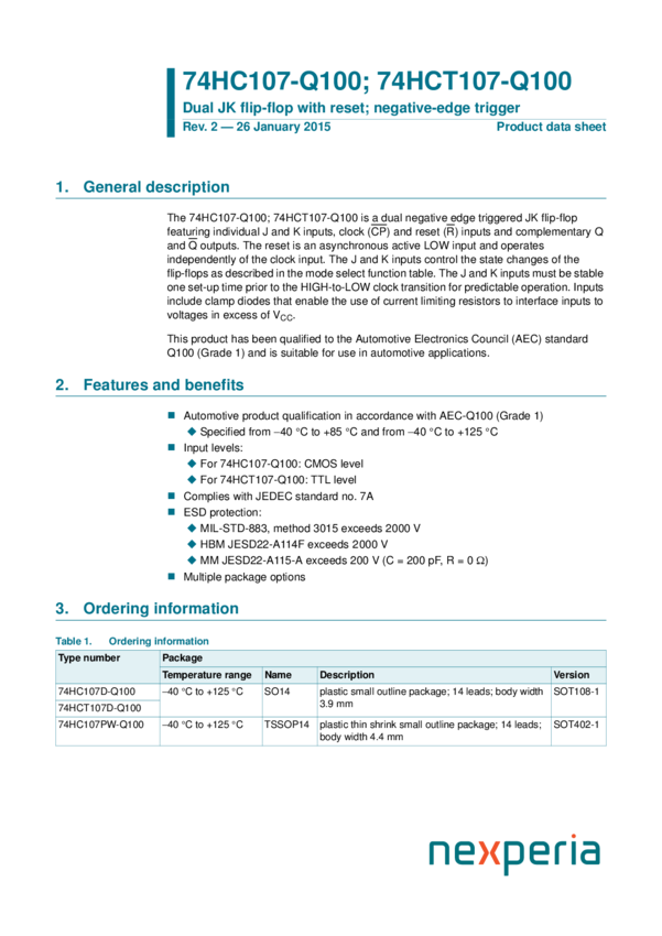 74HCT107D-Q100 Dual JK flip-flop with reset; negative-edge trigger