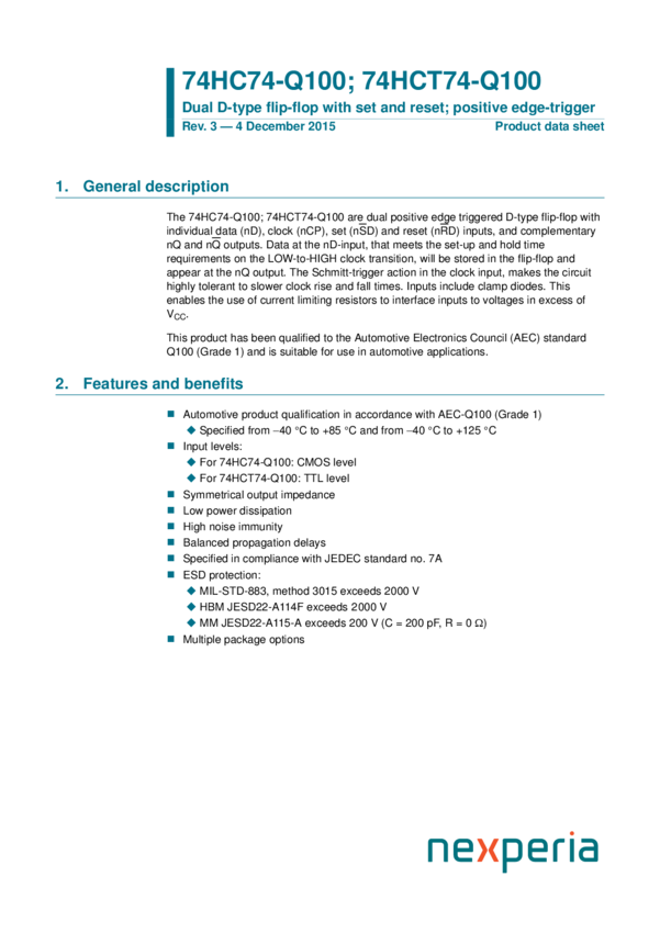 74HCT74D-Q100, 74HCT74BQ-Q100, 74HCT74PW-Q100, 74HC74BQ-Q100, 74HC74PW-Q100