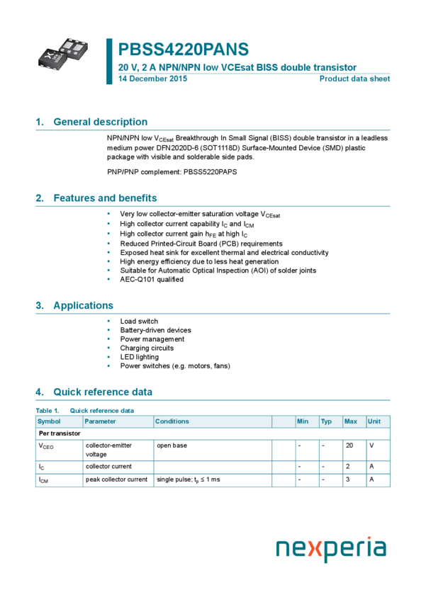 PBSS4220PANS 20 V, 2 A NPN/NPN low VCEsat BISS double transistor
