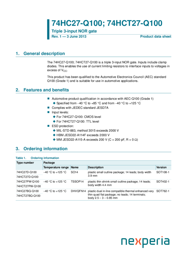 74HCT27BQ-Q100, 74HCT27PW-Q100, 74HC27BQ-Q100, 74HC27PW-Q100, 74HCT27D-Q100