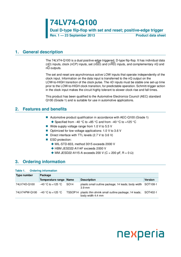 74LV74D-Q100 Dual D-type flip-flop with set and reset; positive-edge trigger