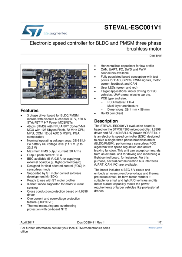 STEVAL-ESC001V1 Electronic speed controller for BLDC and PMSM three phase brushless motor