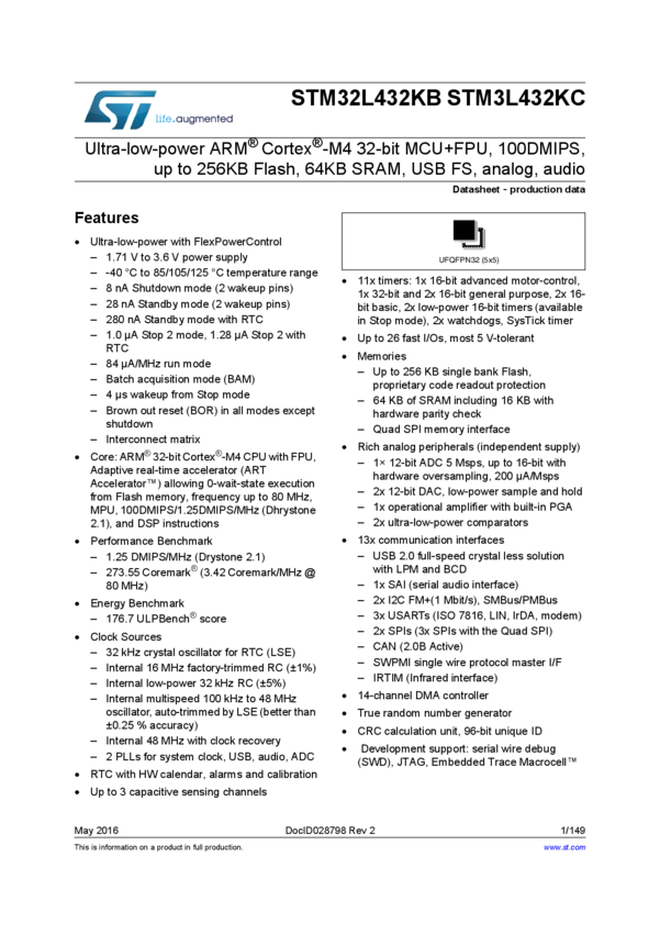 STM32L432KC Ultra-low-power with FPU ARM Cortex-M4 MCU 80 MHz with 256 Kbytes Flash, US...