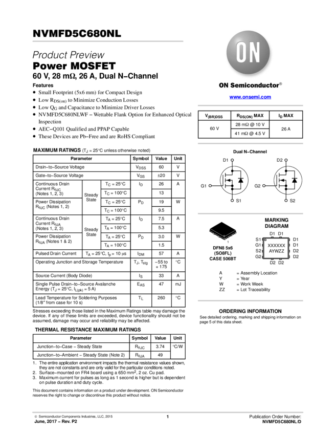 NVMFD5C680NL Power MOSFET 60V, 17A, 39 mOhm, Dual N-Channel, SO8-FL, Logic Level.