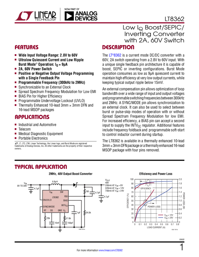 LT8362 Low IQ Boost/SEPIC/ Inverting Converter with 2A, 60V Switch