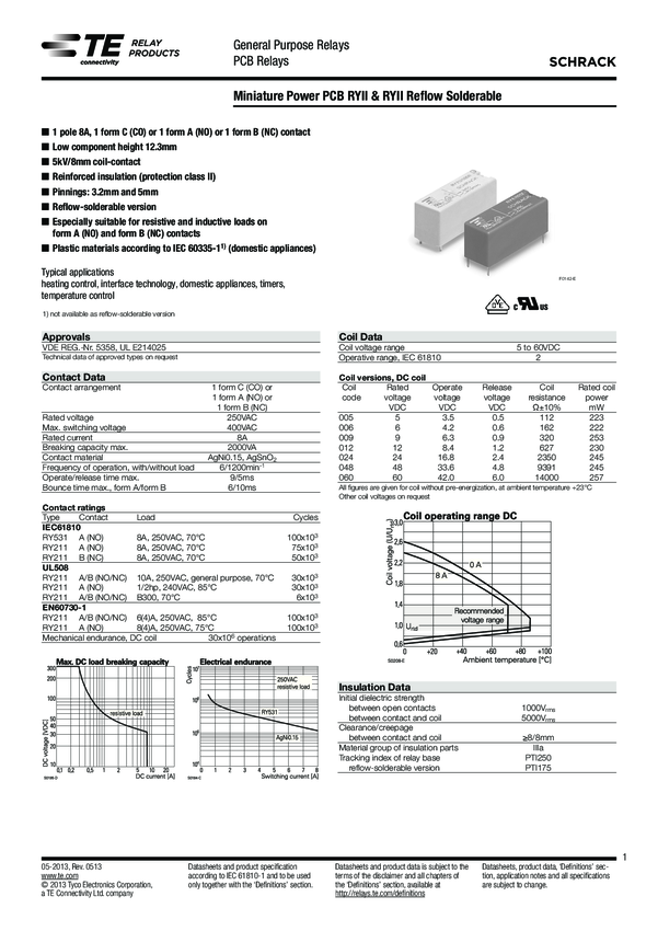 1-1393225-6 Electromechanical Relay SPDT 8A 60VDC 14KOhm Through Hole