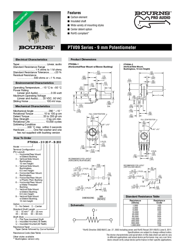 PTV09A-4020FB503 Res Carbon Film POT 50K Ohm 20% 1/20W 1(Elec)/1(Mech)Turn 6mm (11.4 X 12.65...