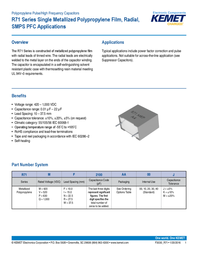 R71MI3470CK00J Cap Film 0.47uF 420V PP 5% (18 X 7.5 X 13.5mm) Radial 15mm 110°C T/R