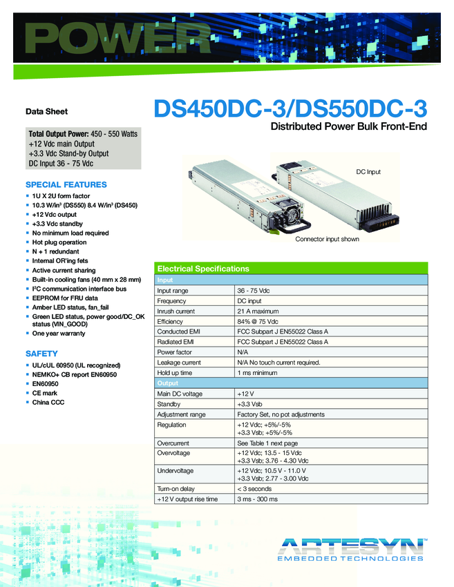 DS450DC-3 DC/DC Power Supply Dual-OUT 12V/3.3V 37A/3A 450W to 550W 30-Pin