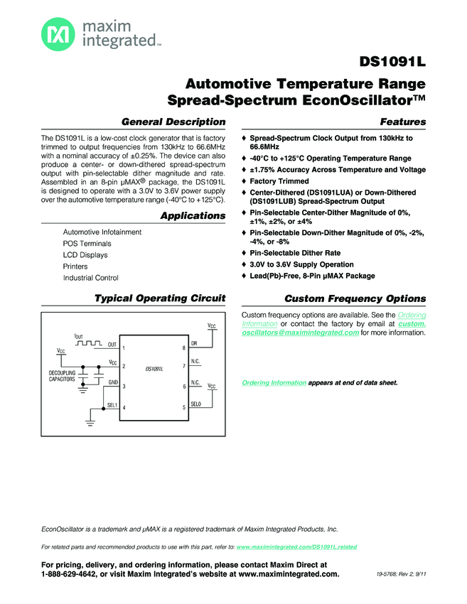 DS1091L Automotive Temperature Range Spread-Spectrum EconOscillator™