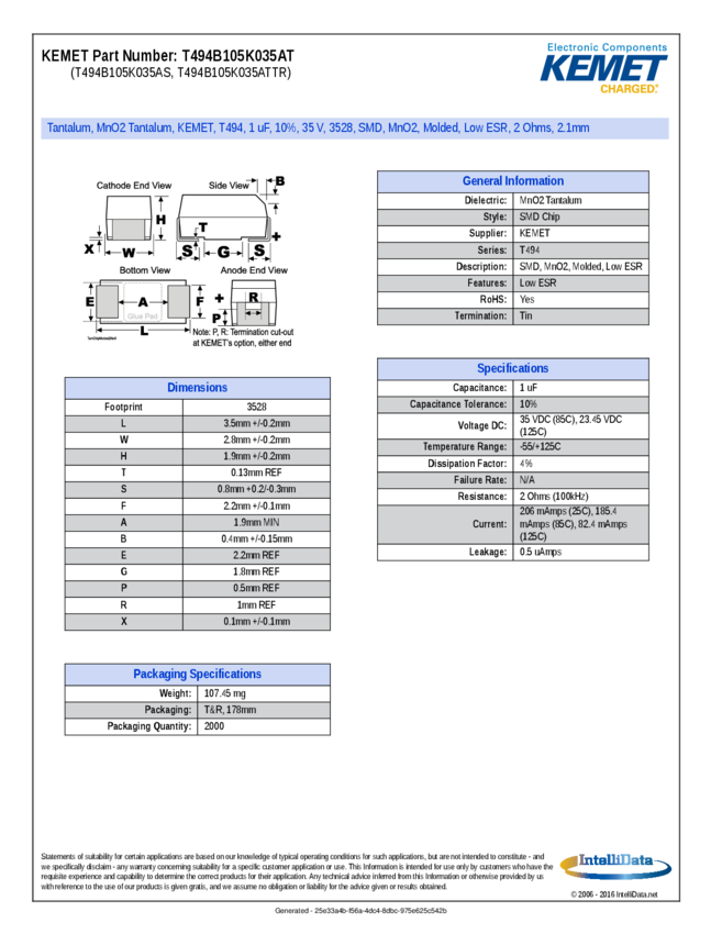 T494B105K035AT Cap Tant Solid 1uF 35V B CASE 10% (3.5 X 2.8 X 1.9mm) SMD 3528-21 2 Ohm 125...