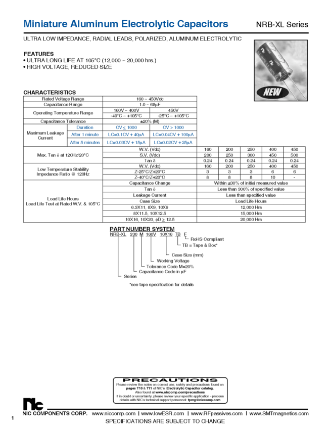 NRB-XL1R0M400V6.3X11F Cap Aluminum 1uF 400V 20% (6.3 X 11mm) Radial Cylindrical 2.5mm 24mA 12000...