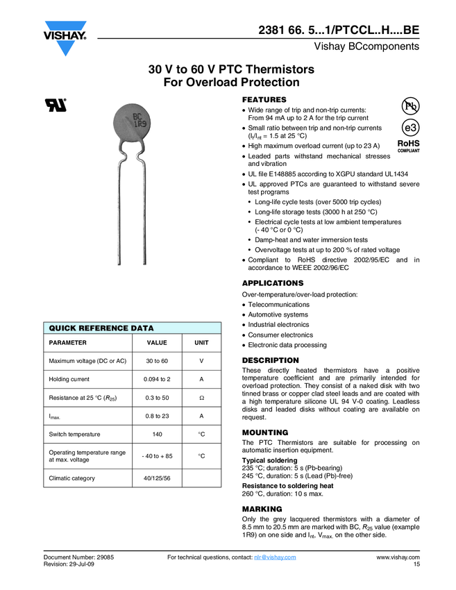 PTCCL13H921DBE Thermistor PTC 13Ohm 20% 2-Pin Radial Bulk