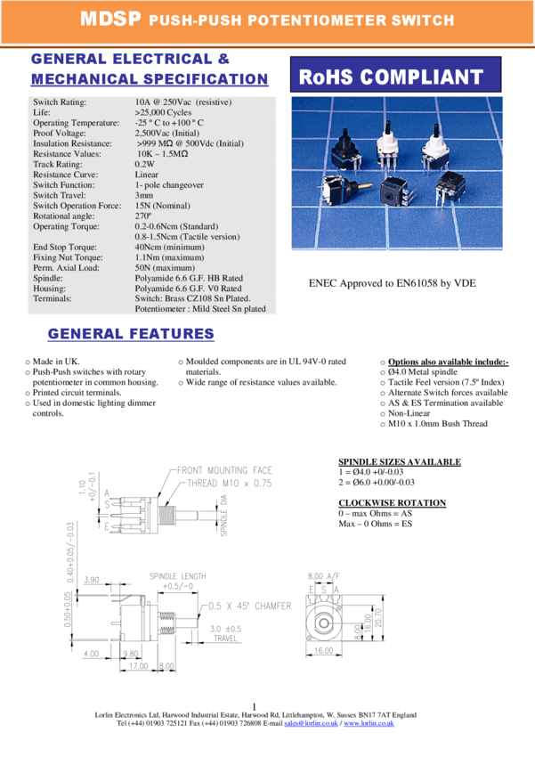 MDSP100KN-ESAI-19PN Switch Rotary SPDT 1 Round Shaft PC Pins 10A 250VAC