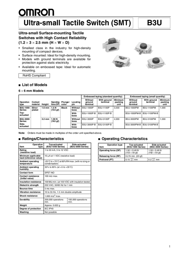 B3U3100PB Switch Tactile N.O. SPST Button Gull Wing 0.05A 12VDC 1.59N SMD Embossed T/...