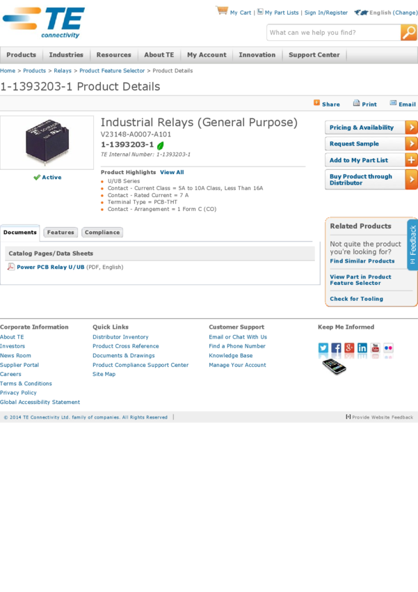 1-1393203-1 Electromechanical Relay SPDT 12A 24VDC 1.28KOhm Through Hole